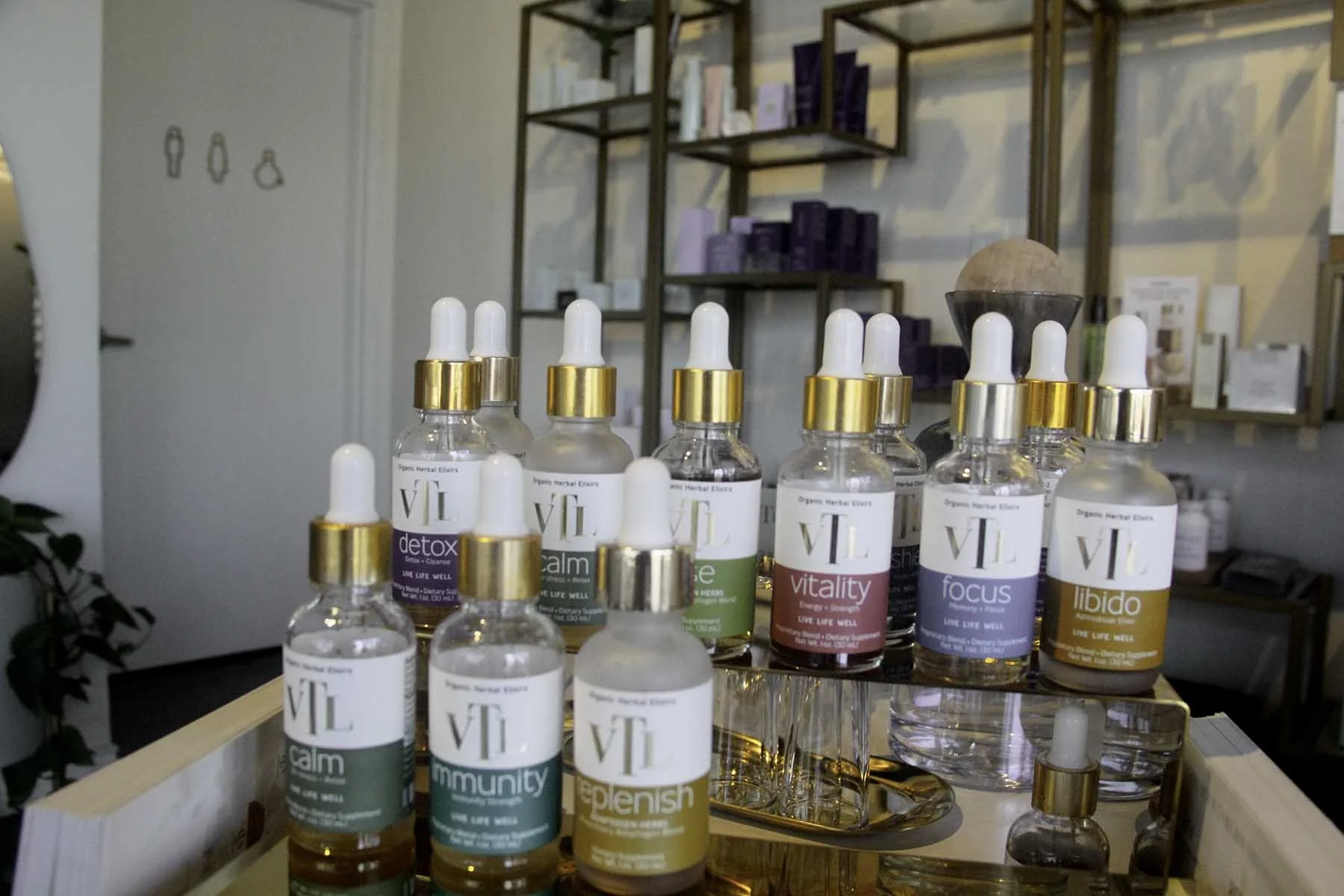 Beyond running the spa with her mom, Julia studied nutrition and specialized in Ayurvedic medicine, where she discovered a love for herbalism. She currently has a line of teas and thought about doing something similar, but realized not everyone is a tea person. That passion eventually led to her beautifully crafted line of seventeen VTL Elixirs, made to help people slow down and care for their bodies intentionally. Each has its own thoughtful blend and purpose – calm, digestion, immunity, energy, libido, and more. Tinctures, long used in herbal medicine, offered a more versatile, approachable experience.